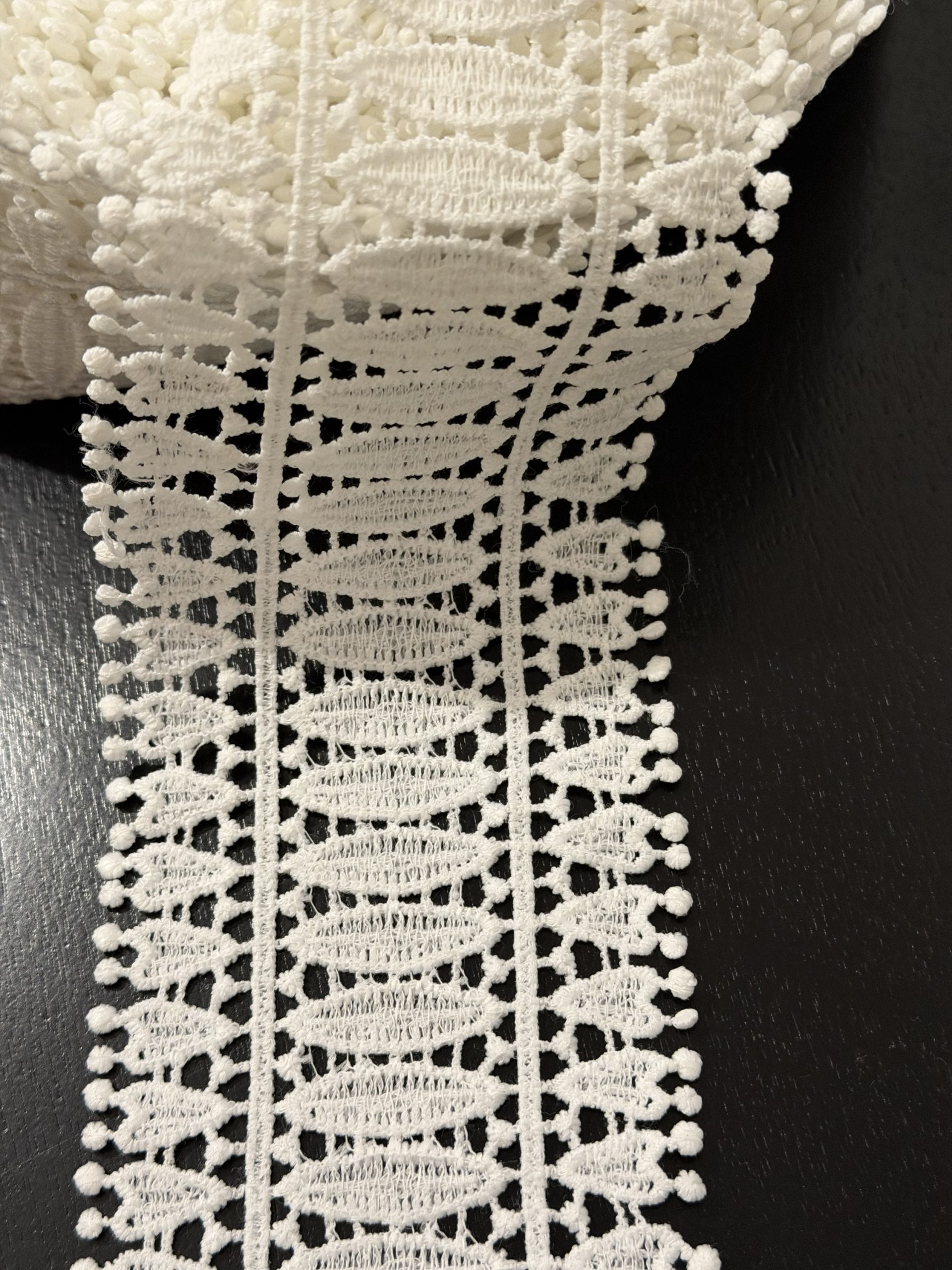 Dantela ușor elastic,are bordură pe ambele părți,pretabilă pentru diferite decorațiuni sau în combinație cu alte materiale.